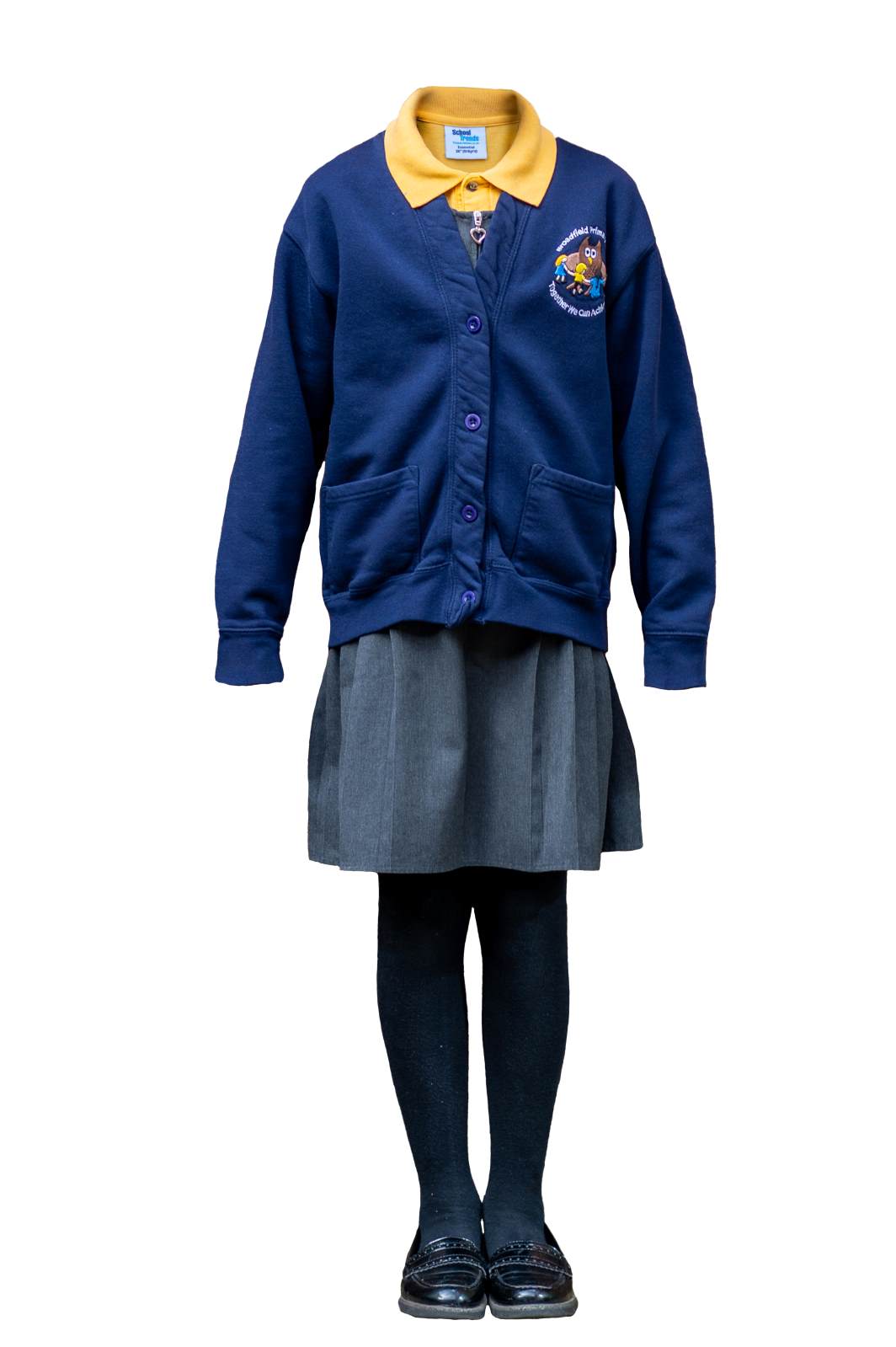- Navy blue sweatshirt or cardigan with embroidered school logo